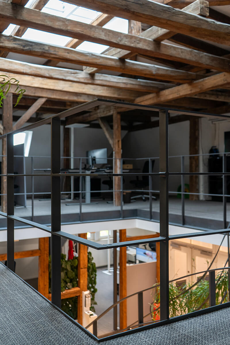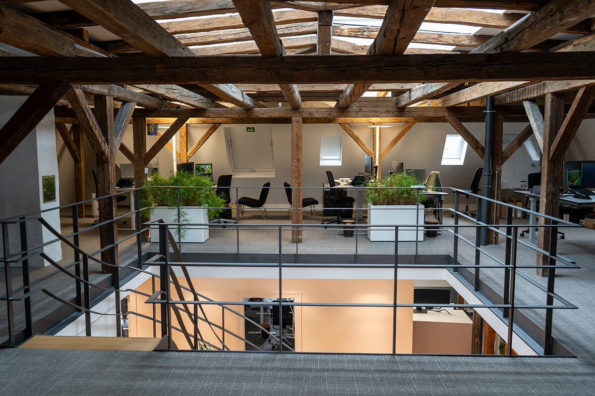 Ein besonderes architektonisches Highlight entstand im Dachbereich: Durch die Öffnung und Verbindung von Dachgeschoss und Dachspitz über einen großzügigen Luftraum wurde zusätzliche Bürofläche mit Galeriecharakter geschaffen. Historische Architektur trifft hier auf moderne Raumdynamik.