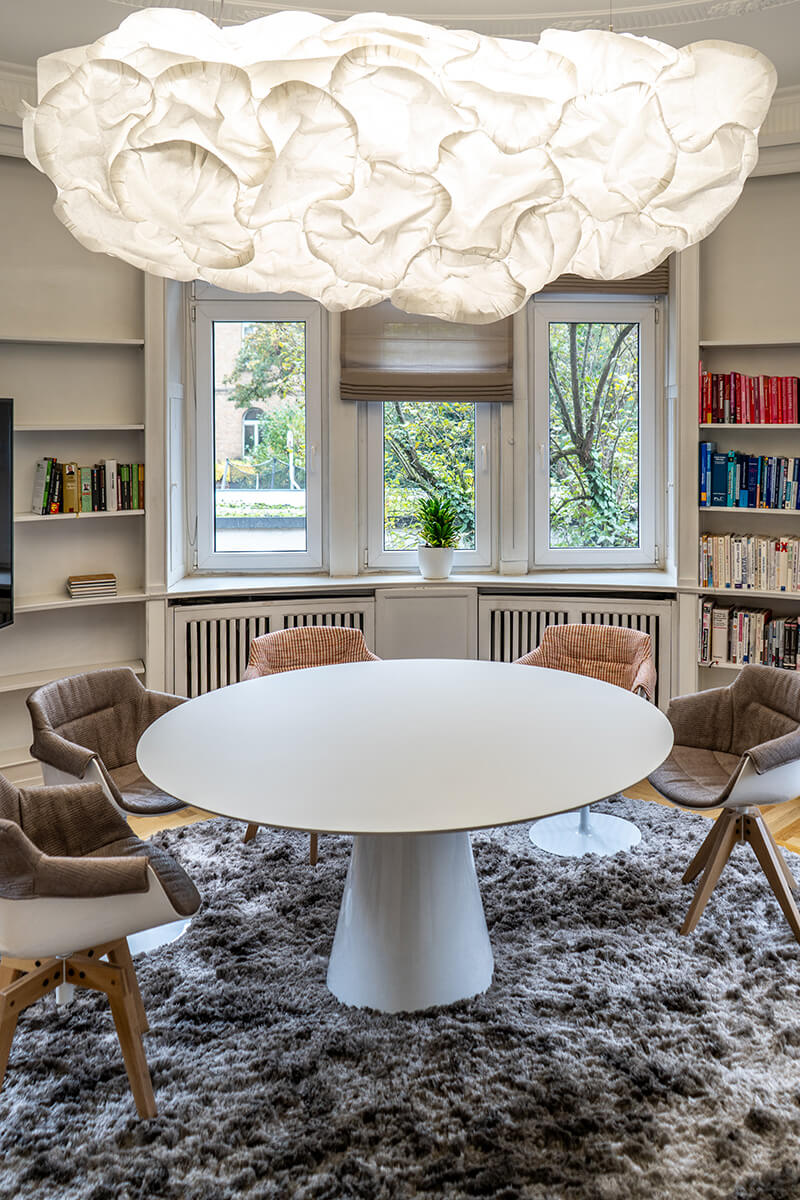 Materialität, Farbgebung und Möblierung wurden bewusst gewählt, um den Charakter der Gründerzeitvilla zu unterstreichen und gleichzeitig eine moderne, leistungsfähige Arbeitsumgebung zu schaffen.